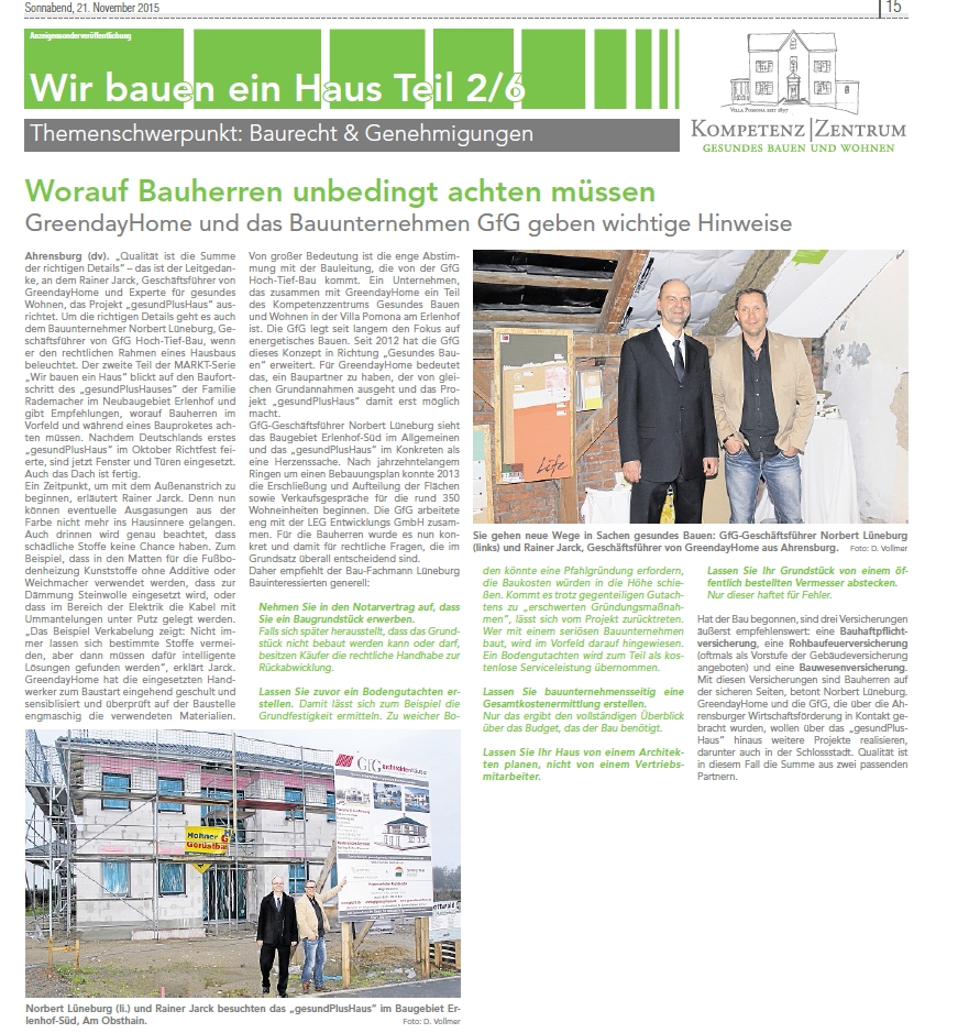 Von großer Bedeutung ist die enge Abstimmung mit der Bauleitung, die von der GfG Hoch-Tief-Bau kommt. Ein Unternehmen, das zusammen mit GreendayHome ein Teil des Kompetenzzentrums Gesundes Bauen und Wohnen in der Villa Pomona am Erlenhof ist. Die GfG legt seit langem den Fokus auf energetisches Bauen. Seit 2012 hat die GfG dieses Konzept in Richtung „Gesundes Bauen“ erweitert. Für GreendayHome bedeutet das, ein Baupartner zu haben, der von gleichen Grundannahmen ausgeht und das Projekt „gesundPlusHaus“ damit erst möglich macht.